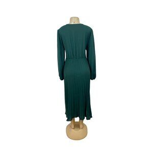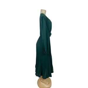 This teal midi dress offers a pleated design with a V-neck and long sleeves. The belted waist accentuates the figure, providing an elegant silhouette.