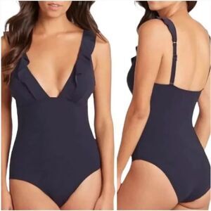 SEA LEVEL Frill One-Piece Swimsuit! Flirty frills trim the low-dipping neck of this shapely one-piece that's ready for some poolside lounging. Color: Night Navy Sky. Hygienic liner. New without price tag. Lined, with removable soft cups 88% nylon, 12% elastane