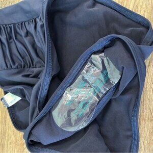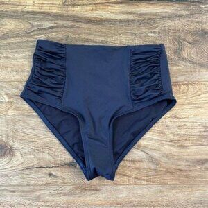Keywords: Designer swimwear High waisted High rise Bikini bottoms Gathered Ruched Neutral Navy blue Sustainable Eco Friendly Eco conscious Recycled Beach Resort Vacation Flattering Slimming