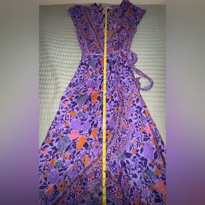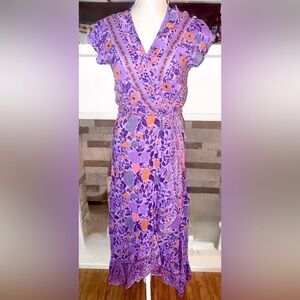 Turn heads in this stunning Sea Lustre wrap dress, featuring a vibrant purple base with orange and lavender floral patterns. The wrap silhouette flatters all body types with its adjustable tie waist, flowy short sleeves, and maxi length high/low hem. Lightweight and breezy, it’s perfect for both casual days and special occasions.