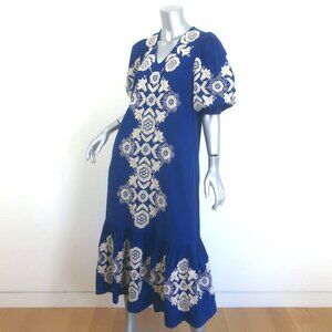 SEA Manuela Embroidered Midi Dress Blue Cotton-Linen Size Extra Small