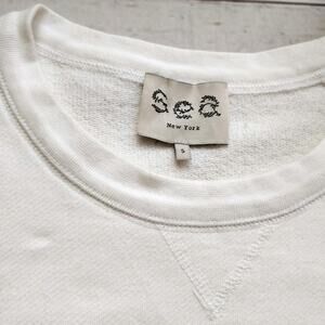 This is a cute Sea New York sweatshirt in size S. Eyelet hem. Some washwear; overall in very good condition. Measures approximately 17" across chest and 20" (back) - 22" (front) in length.