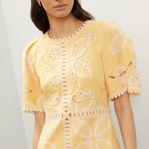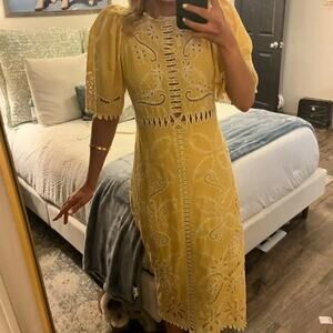 Gorgeous designer embroidered dress in a butter yellow with white embroidered eyelet detail throughout.The playful puff sleeves and scalloped details add a whimsical touch. Romantic, cottage core vibes. ,