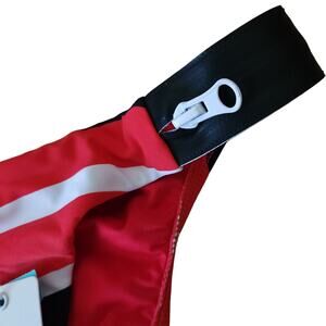 The bold chili red stripes and functional zipper make this piece both playful and practical, giving you the perfect balance of style and comfort.