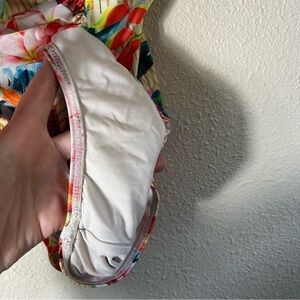 SEAFOLLY Butterfly Coast Halter Maillot Swimsuit. 10460BAM 86607. Maillot one-piece swimsuit by Seafolly in Butterfloy Coast, a gorgeous bamboo, floral botanical print of pink, yellow, green, blue, red and orange. Super pretty and perfect for the beach or a vacation. Adjustable halter tie neckline with front and back tie detail. Ruched sides for a flattering fit. Pattern varies. US Size 6.