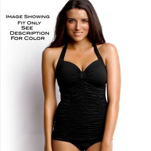 This tankini is made for comfort. The straps in the back can either be worn halter style or converted to a criss cross to take the weight off of the neck. The straps are adjustable for a perfect fit and lift. Lots of ruching in the tummy. The goddess fabric is so soft and silky. The cups are molded, but not stiff. There is a supportive shelf bra that is much more comfortable than an underwire. A great top to be worn all day either at swim or play. I have the American Sizes listed.