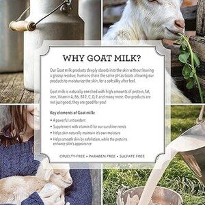 Goat milk, known for its moisturizing properties and ability to help maintain the skin's microbiome, and eucalyptus for a refreshing fragrance.