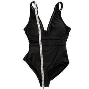 SEA LEVEL Black Spliced One-Piece Swimsuit! Beautiful dipped neckline and comfy adjustable straps. Lightly padded removable cups with elastic band underneath for support. Hygienic liner. New without price tag.