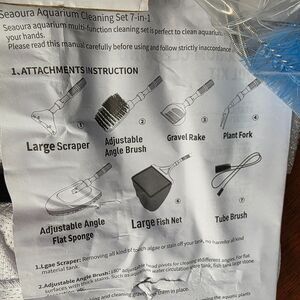 Introducing the SEAOURA 7-in-1 Aquarium Cleaning Tool – your all-in-one solution for effortless aquarium maintenance! This versatile cleaning set is packed with everything you need: a large scraper, adjustable angle brush, gravel rake, plant fork, flat sponge, large fish net, and aquarium filter hose brush.