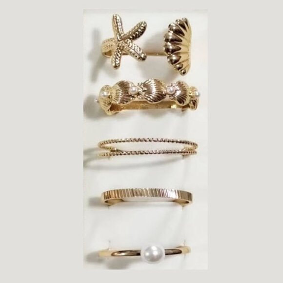 SET OF 5 SEASHELL / NAUTICAL THEMED RING SET SIZES 6, 7, 8 AND WITH PEARL DETAILS.