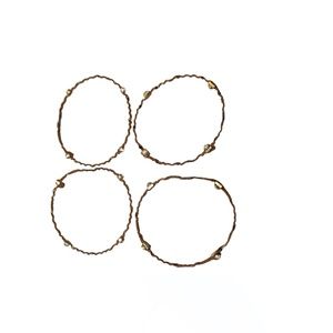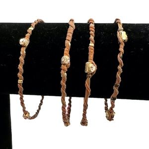 Seasonal Whispers NYC 24k gold wire plating bracelets wrapped in brown suede with Swarovski amber crystals. Set of 4. 2 bracelets have round crystals bezel set and the other 2 have the round crystals bezel set and atop a square. In very good preowned condition. The opening across the middle is 2.75" There is no tag that usually hangs from one of the bracelets in their sets.