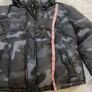 Black/grey camo zip up jacket with removable hood, the bottom of the sleeves are ribbed to keep the cold air out. Front slit pockets and a cord to make the bottom tighter for added warmth.