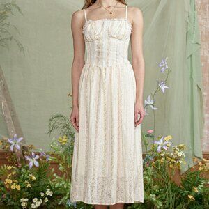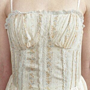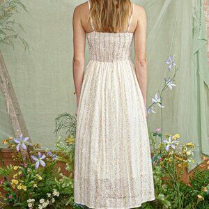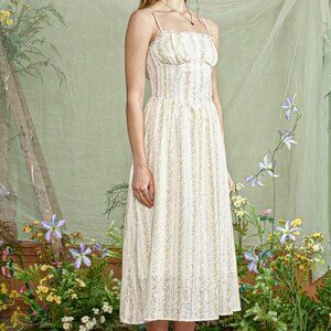 Features: * Romantic midi features a corset-inspired bodice with ruching and soft floral patterns. Materials & Care: * Care: Hand wash only Sizing: * Model is is 5'7", wearing a size S