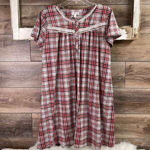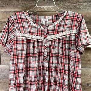 Secret Treasures Sleepwear red, grey and black plaid nightgown with white eyelet trimming, baby doll buttons and soft fabric 95% Polyester. 5% Spandex