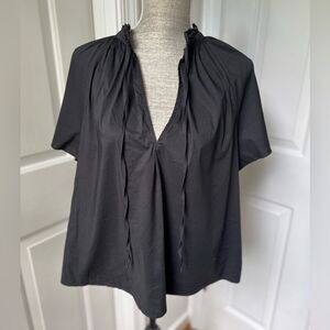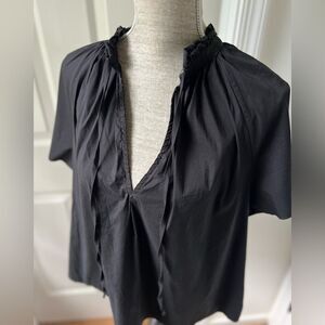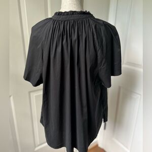Great Shirt from Secular made of comfortable rayon. It features a ruffle collar with a tie and short flowy sleeves. No flaws noted.