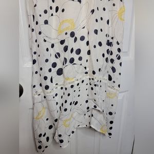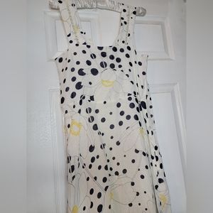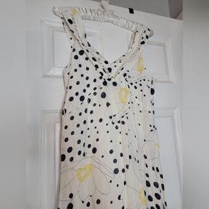 SEE BY CHLOE Floral Dot Maxi Dress in White, Navy and Yellow features a white background with navy dots & flowers throughout, a v-neck, and a side zipper closure.