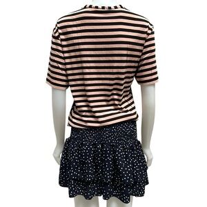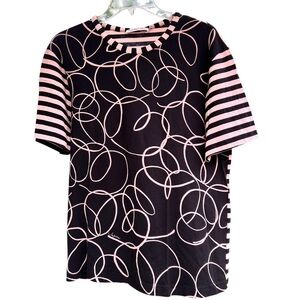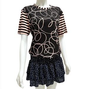 This SEE BY CHLOE artsy top features a captivating black and cream graphic design with a boxy fit and short sleeves. The artistic swirling patterns on the main body are beautifully contrasted by the striped sleeves, offering a playful and stylish aesthetic.