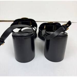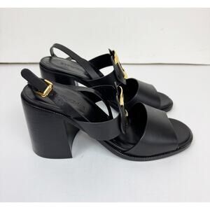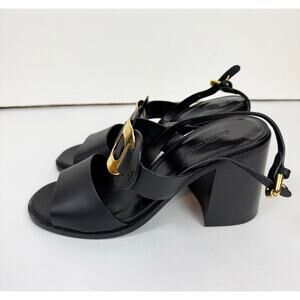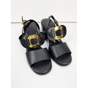 Description: matte finish. gold-tone logo plaque. branded leather insole. buckle-fastening slingback strap. open toe. 90mm high-heel. rubber sole.