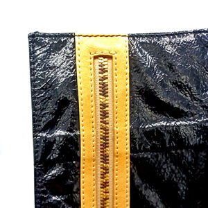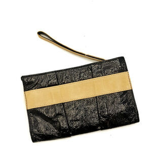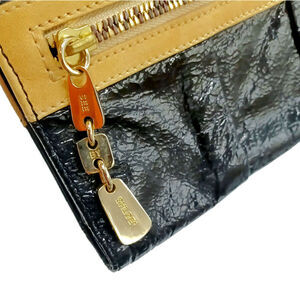 Beautiful Designer Wallet with some unique features: a dual tone Zipper Closure with a 3 segment Logo Pull and gorgeous black Crinkled patent leather with both Gold and Silver Tone Hardware and Tan Leather Accents. It's many compartments and the Zipper Pull that doubles as a Wrist Strap make it the perfect travel and day to night companion.