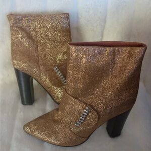 Step out in style with these stunning gold ankle boots. Featuring a chic rhinestone detail, these boots are perfect for adding a touch of glamour to any outfit. 100% AUTHENTIC NEW(STORE DISPLAY ITEM SOME SCRATCHES ON THE BOTTOMS FROM STORE TAGS AS SHOWN)
