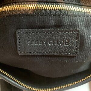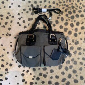 SEE by Chloe shoulder bag, gray canvas with black leather trim. optional adjustable shoulder strap included, two big storage pockets on the front with magnetic closures. This bag is brand new and has never been used. Still have original packaging. It measures overall 14" w x 10" h x 5" d.
