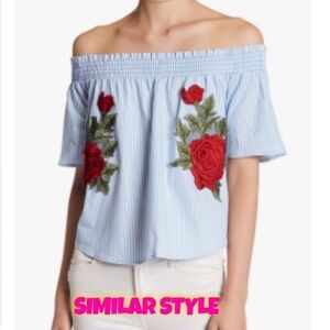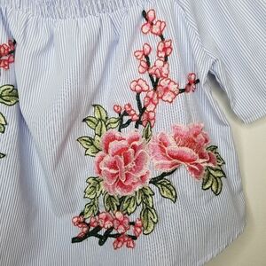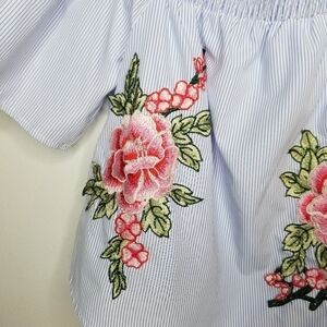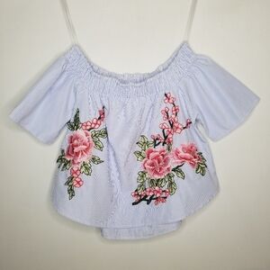 SEEK THE LABEL Rum Stripe Floral Off The Shoulder Crop Blouse Blue Women's Small
