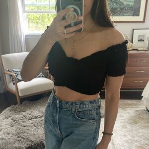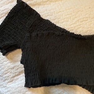 Seek scrunch top in black. Adorable off the shoulder faux wrap style. Very good condition. Size small. Perfect to wear under a blazer!