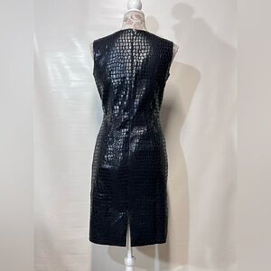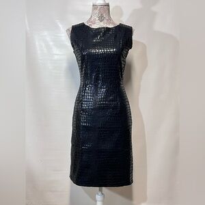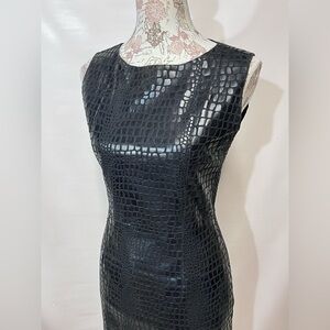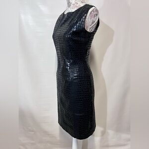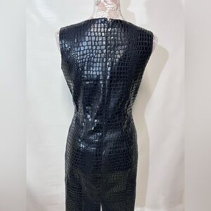 Black reptile print sleeveless sheath dress by SELENE SPORT, size S. Has round neckline, fully lined and zip back. Pre-loved, but still in good condition. There is some wear to fabric in the under arm area from what looks like rubbing or cleaning the fabric. (See photos) otherwise