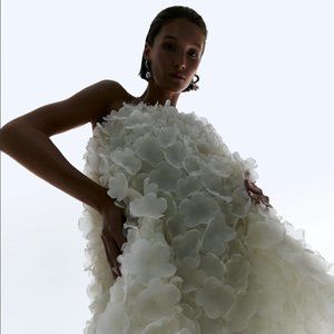 Nuala off-shoulder mini dress is shaped to an elegant 1960-s inspired A-line silhouette and embellished with voluminous handmade flowers to create a 3d effect. The garment is made of polyester organza crafted of recycled plastic bottles.
