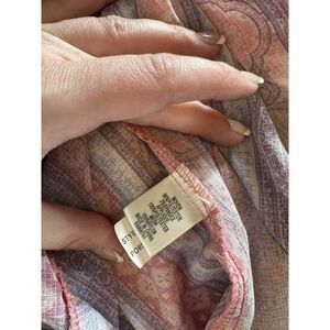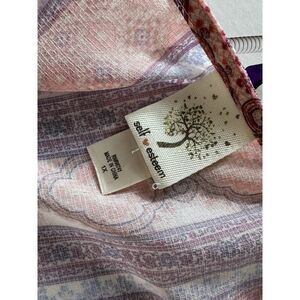 This is a boho-inspired vest for women in size 1X by Self Esteem. It features a colorful geometric pattern with lace accents, an open neckline, and flowy sleeveless design. Made from a nylon spandex blend, this multicolored vest is suitable for casual or travel occasions in any season.