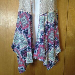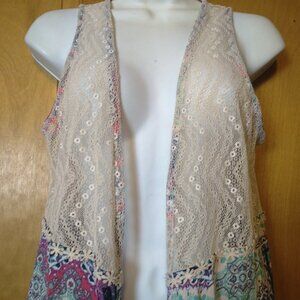 Self Esteem women's Small sleeveless vest has open front with the top part being intricate lace and the bottom being a multicolored paisley print.