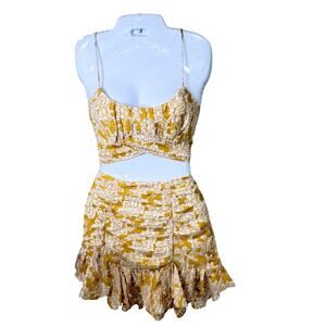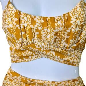 SELFIE LESLIE Linka Ruched Cropped Top / Ruffle Skirt Set Leaf Print Yellow Sz M