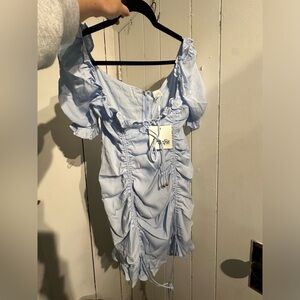 Chic light blue mini dress with ruched detailing. Features puff sleeves and a tie front. Never been worn new with tags. A little too short for me!