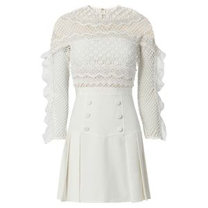 New with tags and extra buttons. Signature guipure lace, jewel neckline, mixed lace detail, long sleeves, cascading ruffled frill trim, button detail, pleated skirt, and back zip.