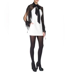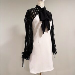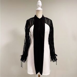 A study in modern layering, this sleek black and white minidress is intricately made with ribbon-like lace at the yoke and sleeves, which split like sheer curtains at the slightest provocation.