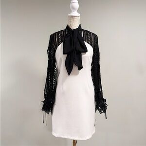 SELF-PORTRAIT Black & White Monochrome Crepe Bow Longsleeve Mini Dress Size 4