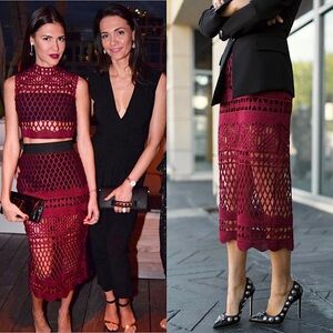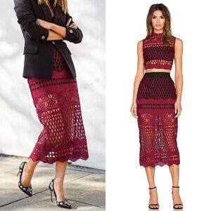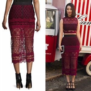 SELF-PORTRAIT Burgundy Sheer Cutwork Lace High Waist Pencil Midi Skirt 2