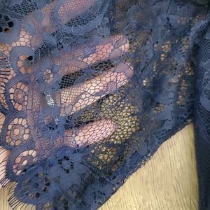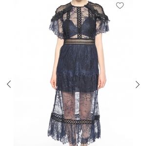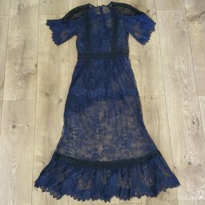 Navy and black lace dress from Self-Portrait. Zip and hook fastenings on the back. Round neck. Short sleeves. Decorative button