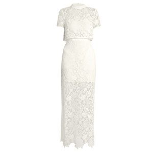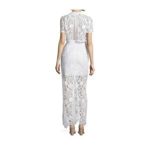 UK8/US4 This lovely maxi dress features floral guipure lace, two-piece illusion, mock neckline, sheer from thighs to hem, center back slit, and back zip. This dress is ideal for special occasions and lovely as a wedding gown. This elegant piece is from Self Portrait's Bridal Collection. Chest 34" waist 26".