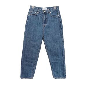 designer SELF/SERVICE jeans in medium blue wash. Ultra high rise 12.5” and cropped length 23” inseam. 13.25” across waist laying flat. Size Large, made in Korea. Excellent condition. Barrel leg style (larger thigh, narrower cuff)