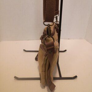 Rustic crossbody bag, messenger bag style, from SELINA VAUGHN STUDIOS in burlap or feedsack printed with International Harvestor logo. Very unique! Pockets up front and zips open to cloth lined interior. Measures 11" wide by 6" tall and 2" deep with adjustable strap drop up to 26". Excellent condition, no damage but then this is a rustic bag. See photos.