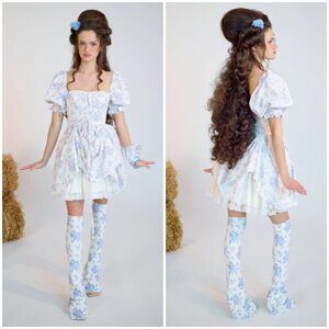 Whether swashbuckling or curtsying, Arthurian or Regency-era, a woman in a corset is not any less powerful than her un-corseted counterpart. Voluminous & ultra-feminine, this dress nods to your favorite romantic heroines of the page & screen. Puff sleeves pair perfectly with a functional laced corset and a bustle shape that can be adjusted to your preference. Wake up and smell the coffee… at your favorite 18th century Bed & Breakfast. This elegant blue floral was inspired by a stay somewhere magical, where the drapes match the bedsheets, and the clucking hens outside your window supply the eggs served from 7-10am.