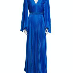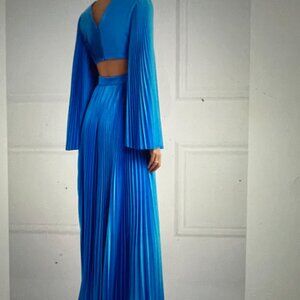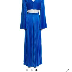 This pleated jumpsuit is cut from satin, which has been painted by hand at our atelier to achieve the gleaming azure tone. The cutout bodice has a softly constructed interlining so you needn't wear a bra, while the '70s-inspired bell sleeves and palazzo legs fan out effortlessly with every movement.