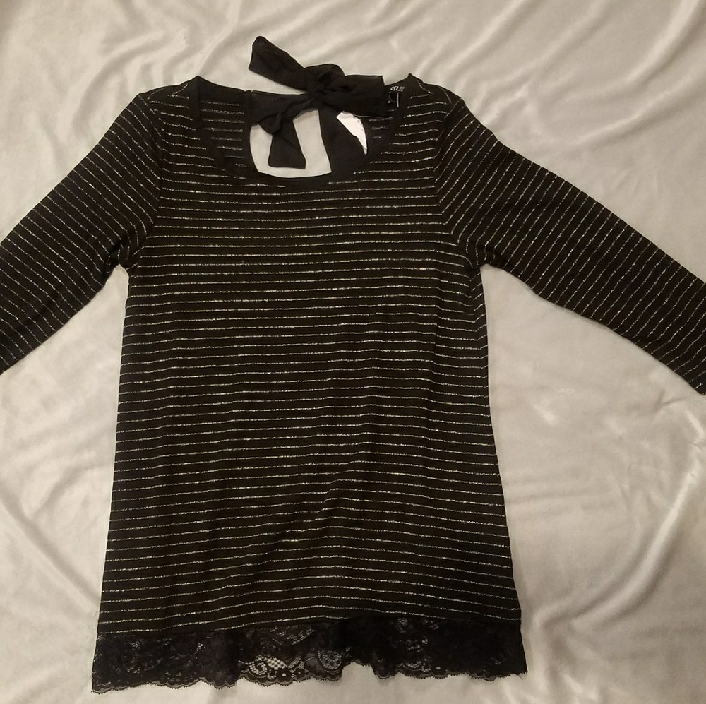 3/4 sleeve, lace detail on bottom. Keyhole back with a cute bow detail on top! Very soft, a bit sheer. Never worn!