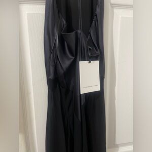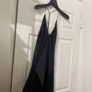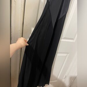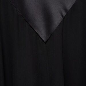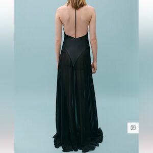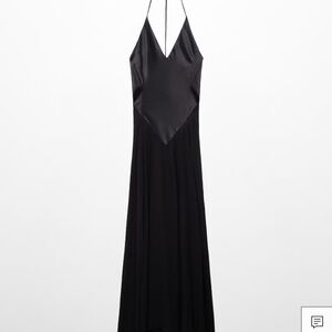 This elegant black backless dress is perfect for any occasion. Its sleek design and sophisticated style make it a must-have in your wardrobe. Mulberry silk-blend fabric. Semi-transparent fabric. Satin weave. Long design. A-line design. Combined design. Full length. V-neckline. Open back. Sleeveless. Thin straps. Bow fastening on the neck.