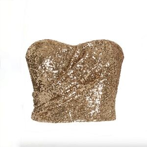 SemSem's signature cutout gold sequin-embellished draped tulle bustier. Lining 93% silk and 7% elastane. The SemSem strapless signature bustier features a sweetheart neck, cropped silhouette, boning at interior, draped detailing, cut out back and concealed zip fastening at the side. It is fully lined. The bustier is brand-new but no longer has the sales tags attached. I also have it listed in silver color, new with tags size Large. The bustier fits true to size.
