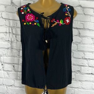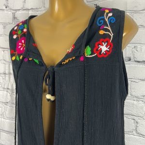 Adorable top in a gauze-like material, featuring a beaded tie at the top and another tie on the top and bottom with the tassels. It is embroidered with red, green, yellow, fuchsia, and very light pink flowers. The back has two embroidered colorful birds on it. This top is so delightful and gorgeous. I would wear it solo with a cute bra underneath or use it as a layering piece. You could even layer it over your bathing suit, post-beach or poolside. The color is dark black. I can see in some of the photos it looks more like a faded black, but it is a deep black.