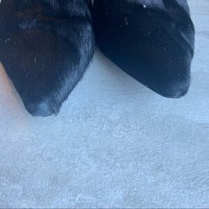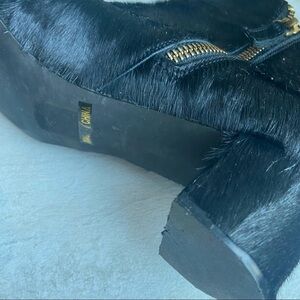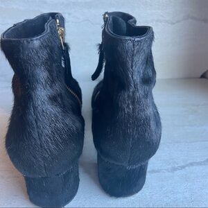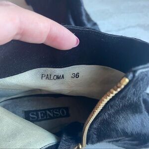 Beautiful senso Paloma leather calf hair black stacked heel booties. Gold accents with side zip, pointed heel. Overall clean with minor wear, see photos. Right toe does have hair missing, barely noticeable when worn but wanted to disclose. Size 36.
