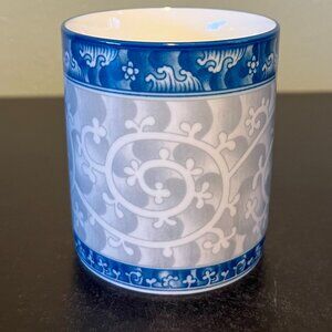 Stylish Seokchon Loko Sweet Porcelain cup with a white, blue, and gray water-themed aesthetic pattern. Measures 3.5” tall with a 3” diameter; 4.5” across including handle. Holds 10 fluid oz. # 2859 Made in Korea
