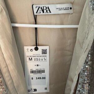Round neck bomber with long sleeves and elastic cuffs. Front hidden in-seam pockets. Sequin appliqué. Front metal zip closure.